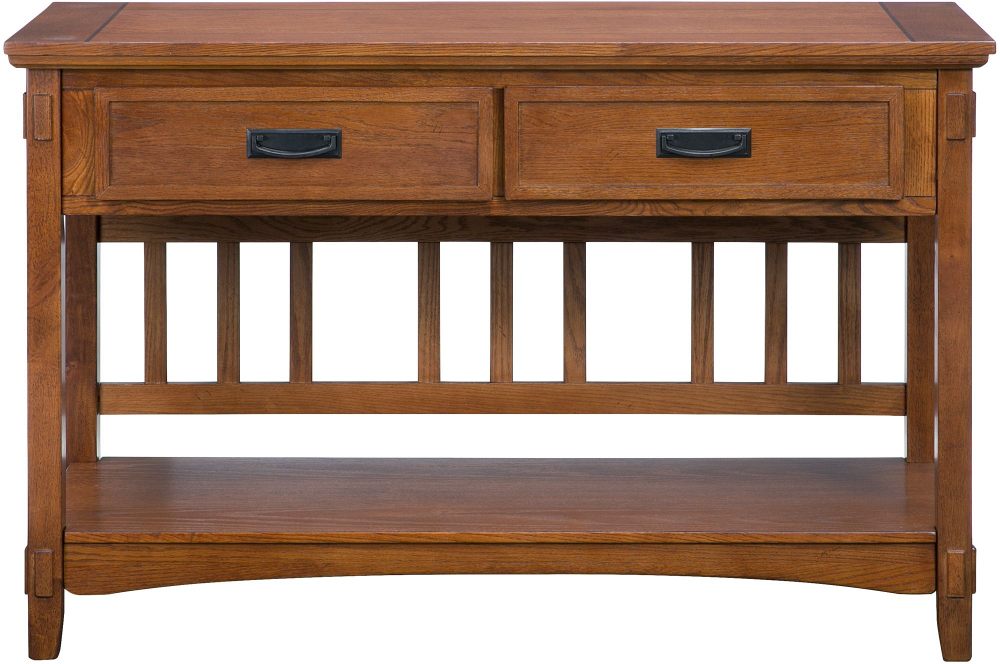 This Cross Island sofa table features beautiful mortise-and-tenon woodwork, arched stretchers, a fixed shelf and 2 smooth-gliding drawers.